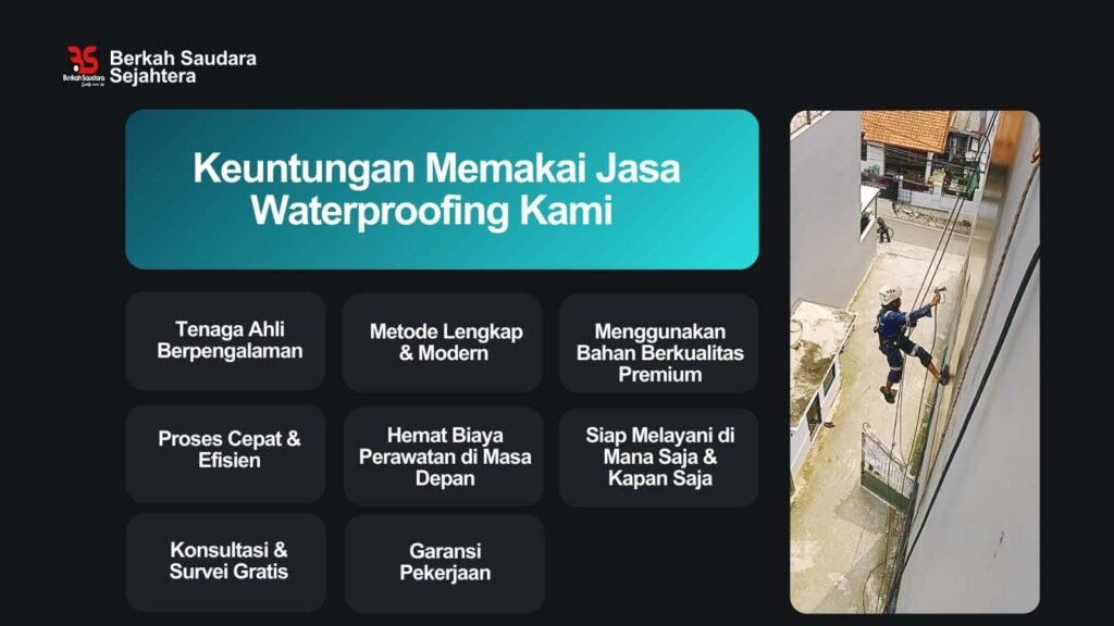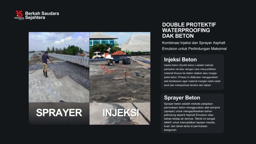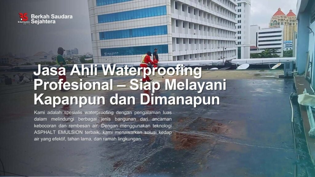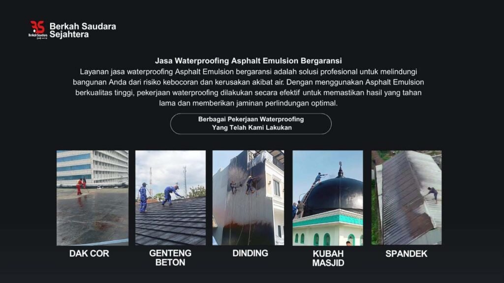Layanan Waterproofing terpercaya yang berfokus pada perlindungan dari kebocoran dan kerusakan air, dengan pengalaman bertahun tahun dan keahlian dalam teknologi waterproofing terbaru, termasuk penggunaan Material ASPHALT EMULSION, kami memberikan solusi tahan lama dan efisien untuk berbagai jenis bangunan.